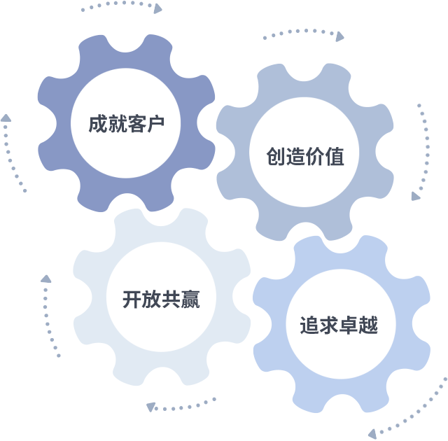 成就客户是一切决策的出发点,,创造价值是衡量所有工作的标准,,,,追求卓越是我们做事做人的态度,,,,开放共赢是我们的格局也是最终的结果。。价值观的齿轮环环相扣,,,推动着组织里的每个人不断向前。。